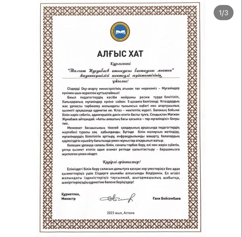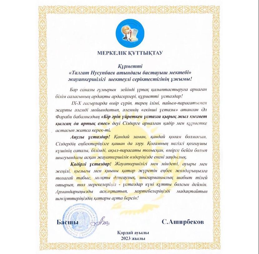 “5 қазан — ұстаздар күніне” орай Талғат Нусупбаев атындағы мектебінің ұжымына Оқу ағарту министрі Ғ.Бейсембаевтың және Қордай аудандық білім бөлімінің басшысы С.С.Аширбековтің алғыс хатымен құттықтау мадақтамасы тапсырылды. Жемісті, шығармашыл еңбектері үшін ұстаздарымыз Битешова Р.Т., Алиева А.Ж. Қордай аудандық білім бөлімінің құрмет грамотасымен марапатталды.