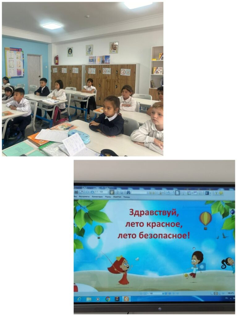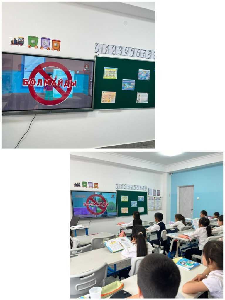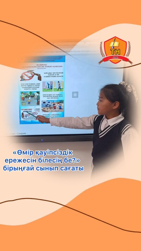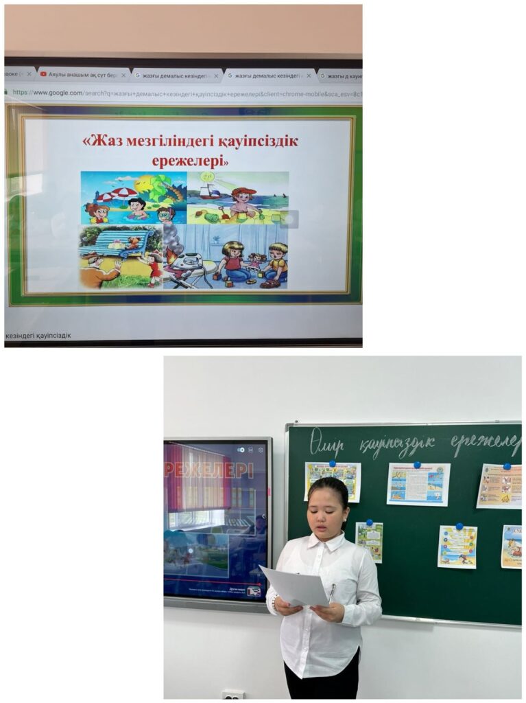 2024 жылдың 20 мамыр күні 1-6 сынып оқушылары арасында «Өмір қауіпсіздік ережесін білесің бе?» тақырыбында бірыңғай сынып сағаты өткізілді. Сынып сағатында оқушыларға жаздағы қауіпсіздік ережесі бойынша (жолда жүру қауіпсіздігі, су айднында, ойын алаңындағы қауіпсіздік) түсіндірме жұмыстар жүргізілді.