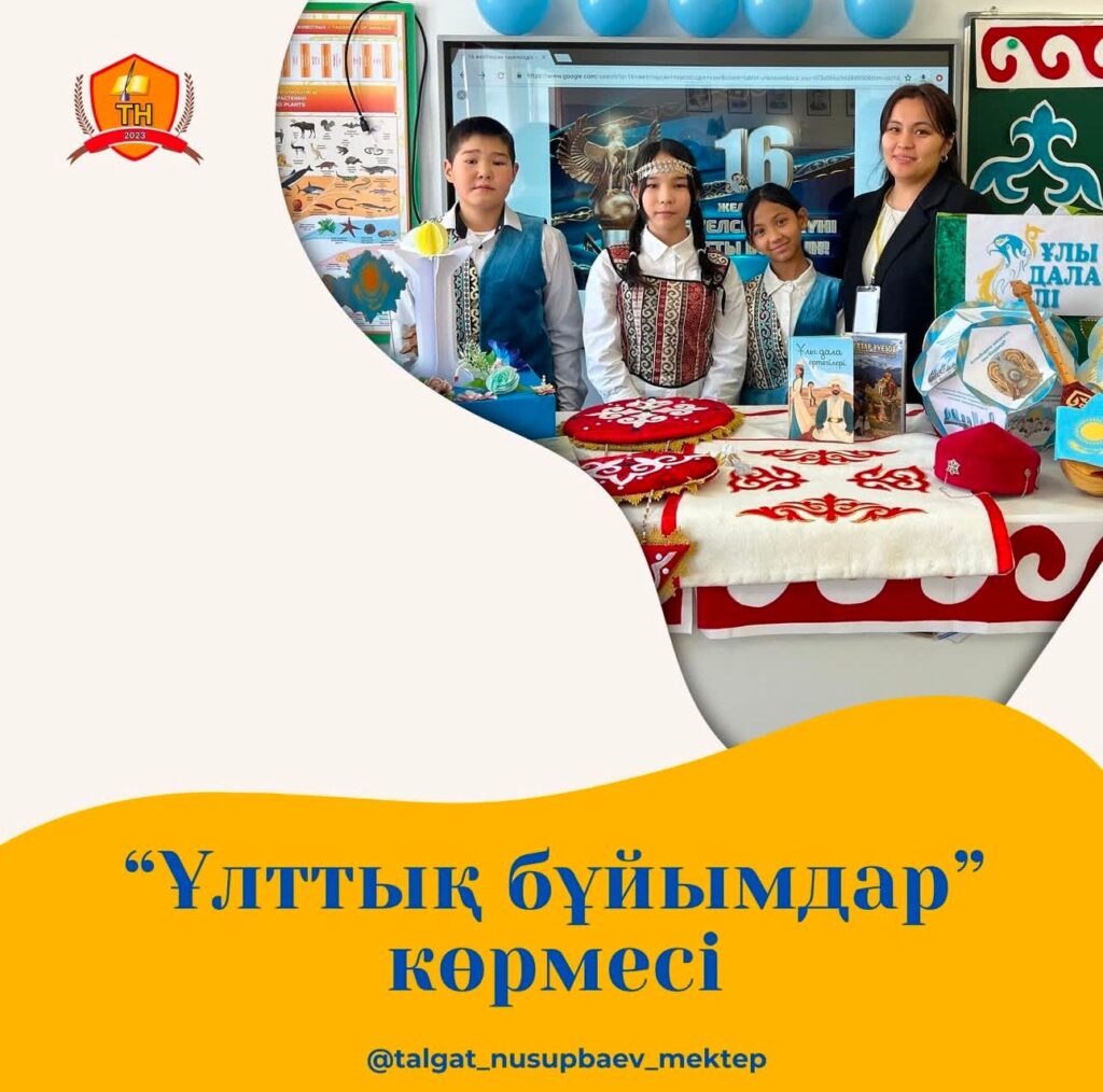 Талғат Нусупбаев атындағы негізгі мектебінде ұлттық құндылықтарды насихаттау және оқушылардың мәдени танымын кеңейту мақсатында “Ұлттық бұйымдар” тақырыбында көрме ұйымдастырылды. Көрмеге мектеп оқушылары мен ұстаздар қауымы белсенді қатысып, қазақ халқының сәндік-қолданбалы өнерінің бірегей үлгілерін ұсынды.